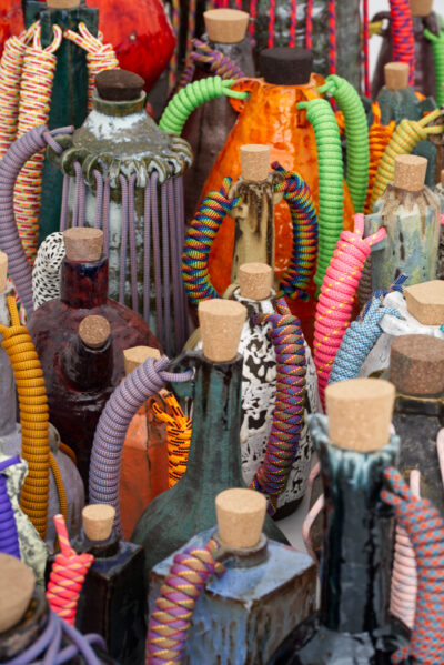 Karl Monies (b. 1984) is a multidisciplinary artist recognized for his distinctive series of decorative lidded vessels—containers, jars, and pots wrapped in vibrant, multicoloured climbing rope and crowned with oversized cork lids. His practice sits at the intersection of craft, material exploration, and sculptural design, often transforming utilitarian forms into tactile, visually compelling objects.