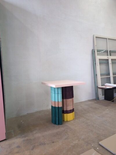 A series of lamps and tables made from Swiss industrial terracotta bricks, known as Swissmodul. Transformed with colorful glazes, the bricks become unique objects that bring together color, texture, form, and light. Each piece is meticulously handcrafted in the studio, with glass lampshades salvaged from demolished houses.