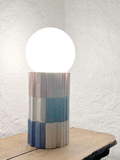 A series of lamps and tables made from Swiss industrial terracotta bricks, known as Swissmodul. Transformed with colorful glazes, the bricks become unique objects that bring together color, texture, form, and light. Each piece is meticulously handcrafted in the studio, with glass lamp shades salvaged from demolished houses.